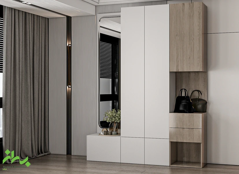ترکیب آینه، کمدهای جادار و طراحی دکوری باعث شده این جاکفشی فقط یک وسیلهی کاربردی نباشد، بلکه بخشی از دکوراسیون داخلی خانه محسوب شود. انتخابی هوشمندانه برای کسانی که به دنبال زیبایی، نظم و کارایی در کنار هم هستند.